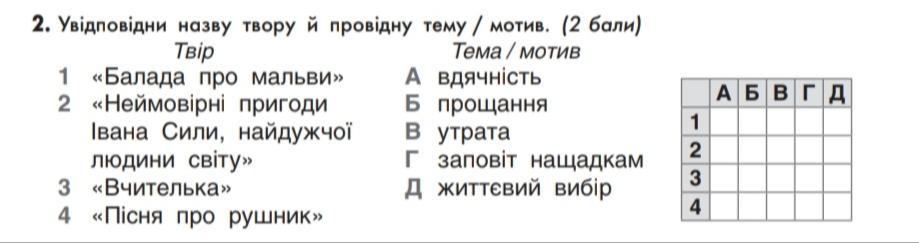 2. Увідповідни назву твору й провідну тему / мотив. (2 бали)