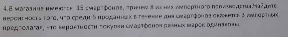 4. В магазине имеются 15 смартфонов, причем 8 из них импортного производства. Найдите вероятность того, что среди 6 проданных в течение дня смартфонов окажется 3 импортных предполагая, что вероятности покупки смартфонов разных марок одинаковы.