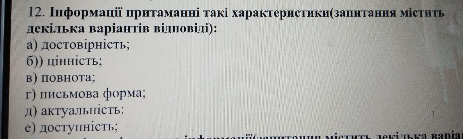 12. Інформації притаманні такі характеристики(запитання містить декілька варіантів відповіді): a) достовірність; б)) цінність; в) повнота; г) письмова форма; д) актуальність: e) доступність;
