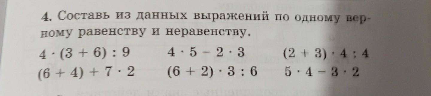 c+c+ 4. Составь из данных выражений по одному вер- ному равенству и неравенству. 4 (3+6): 9 . (6 + 4)+7-2 4 5 2 3 . (6+2) 3:6 (2+3) 4:4 5 4 3 2