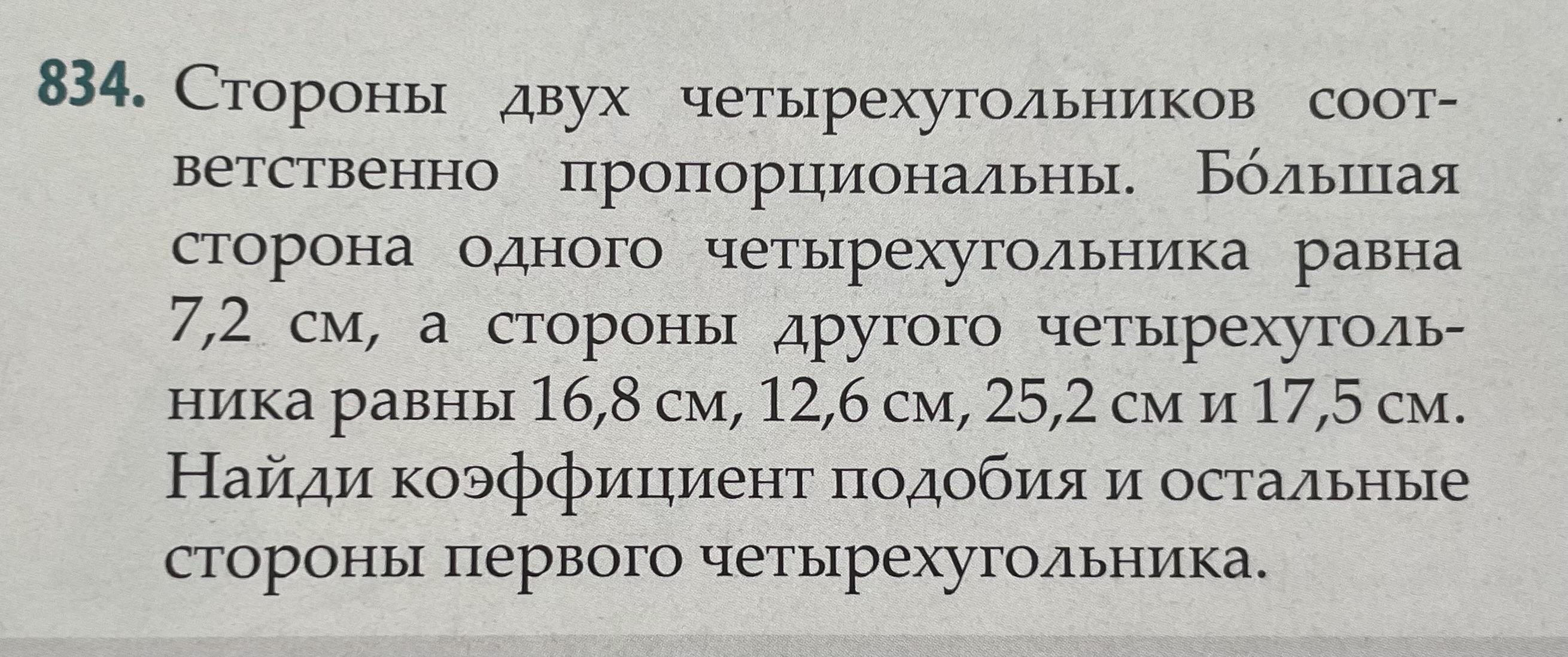 Пусть большая сторона первого четырехугольника равна 7,2 см, а стороны второго четырехугольника равны 16,8 см, 12,6 см, 25,2 см и 17,5 см.