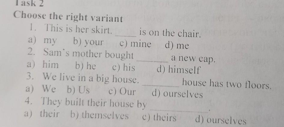 Task 2 Choose the right variant 1. This is her skirt. is on the chair. d) me a) my 2. Sam's mother bought a) him b) he c) his 3. We live in a big house. c) Our b) your c) mine a) We b) Us 4. They built their house by a) their b) themselves a new cap. d) himself house has two floors. d) ourselves c) theirs d) ourselves