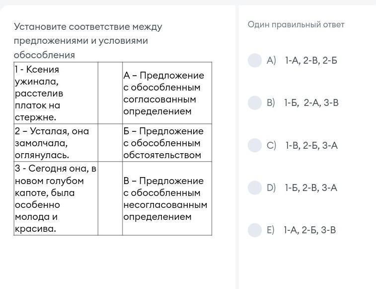 ПОМОГИТЕ ПОЖАЛУЙСТА. Установите соответствие между предложениями и условиями обособления 1-Ксения ужинала, расстелив платок на стержне. 2 - Усталая, она замолчала, оглянулась. 3 - Сегодня она, в новом голубом капоте, была особенно молода и красива. А - Предложение с обособленным согласованным определением Б - Предложение с обособленным обстоятельством В - Предложение с обособленным несогласованным определением Один правильный ответ А) 1-А, 2-В, 2-Б В) 1-Б, 2-А, 3-В С) 1-В, 2-Б, 3-А D) 1-Б, 2-В, 3-А Е) 1-А, 2-Б, 3-В