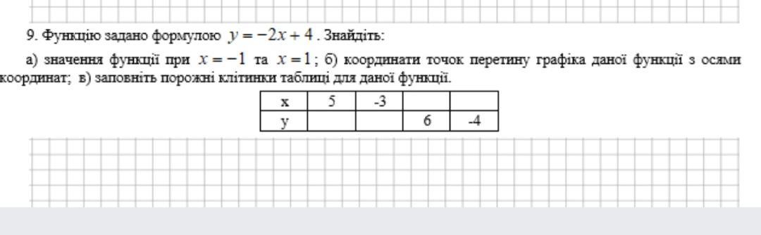 СУПЕР СРОЧНОООО функцію задано формулою y=-2x+4 Знайдіть a)значення функції при x=-1 та x=1; б) координати точок перетину даної функції з осями кординат В заповніть порожні клітини таблиці для даної функції