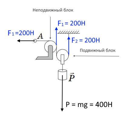 Неподвижный блок не дает выигрыша в силе, но позволяет поменять направление приложенной силы (F₁). Тянуть за кольцо нужно с силой: