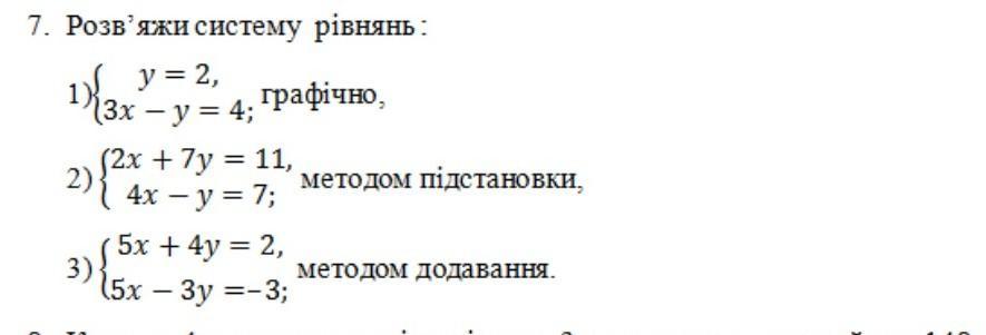 помогите пожалуйста я тупая 7. Розв'яжи систему рівнянь: 2, 1){3x2-y= 4; графічно, (2x +7y = 11, методом пiдстановки, 4x-y=7; 5x +4y = 2, (5x-3y=-3; методом додавання