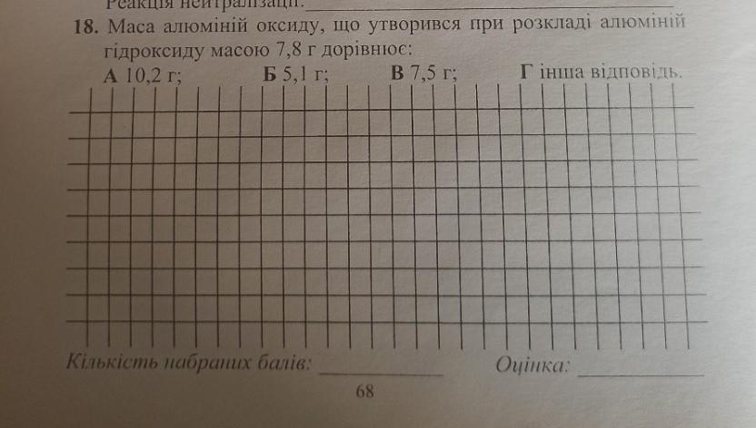 18. Маса алюміній оксиду, що утворився при розкладі алюміній гідроксиду масою 7,8 г, дорівнює: