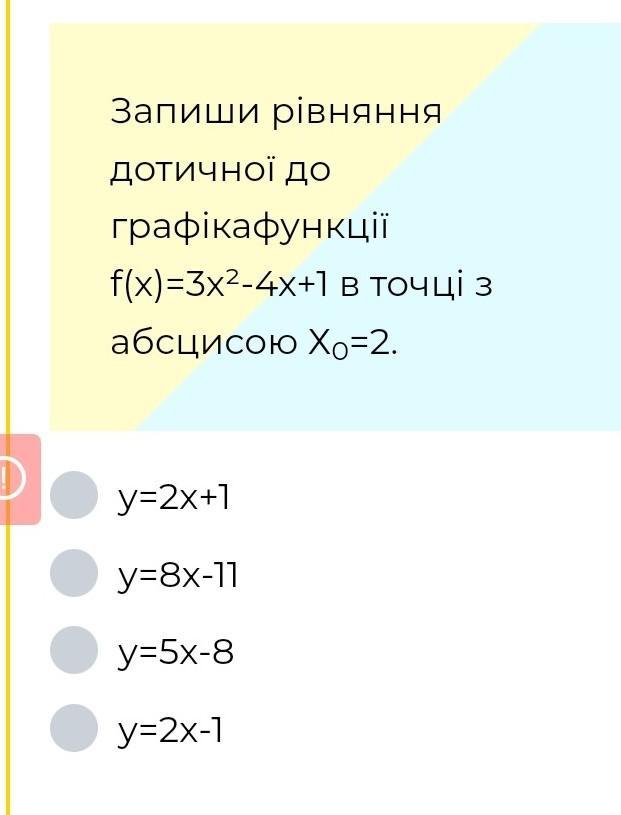 50 БАЛЛОВ!!!!СРОЧНО!!!!Запиши рівняння дотичної до графіка функції f(x)=3х^2-4х+1 в точці з абсцисою Х0=2