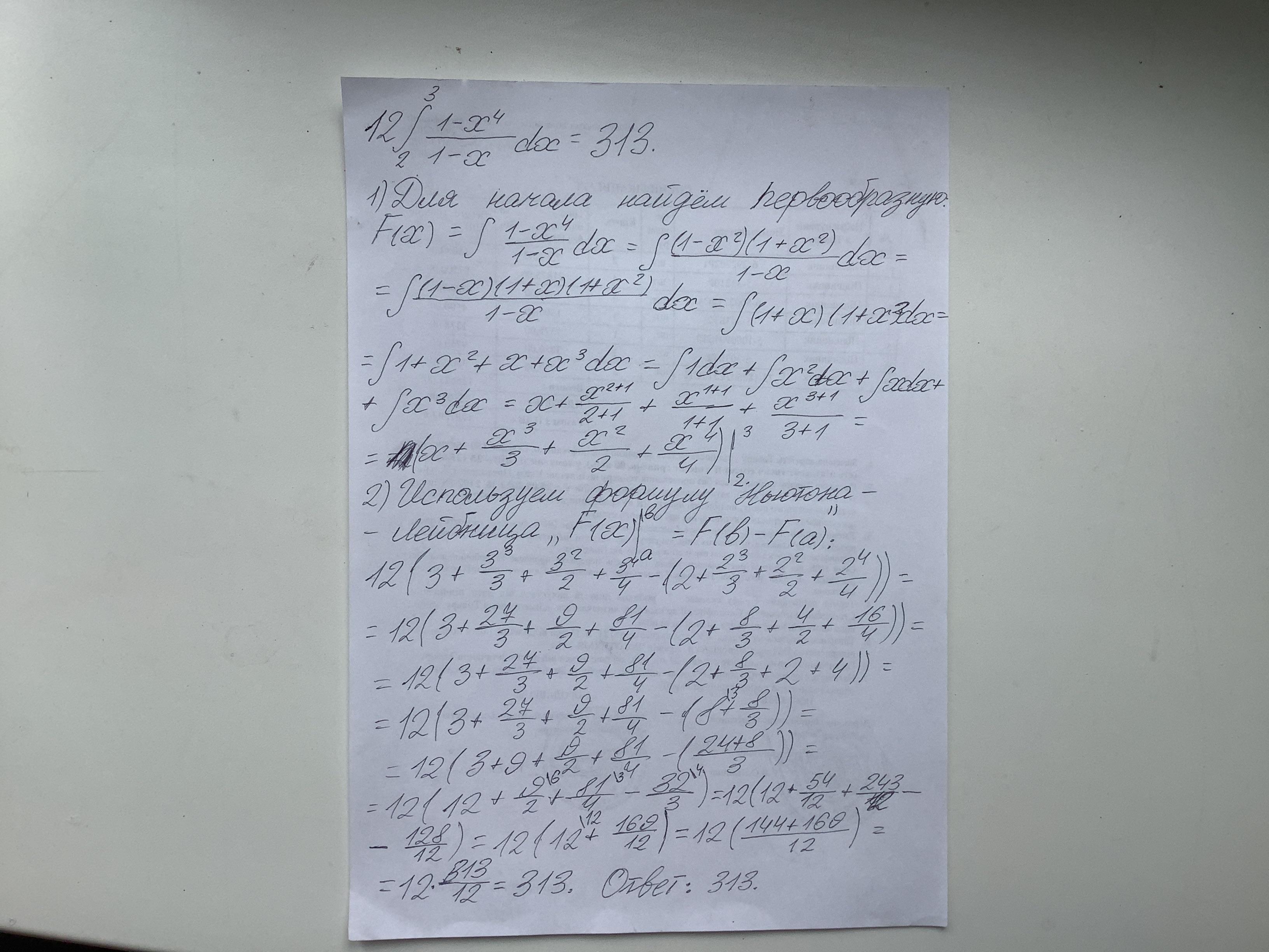 Здравствуйте, спасибо за задачу. Для решения определенного интеграла сначала найдём первообразную(F(x)). Чтобы найти первообразную нужно найти неопределённый интеграл, разложим числитель по формуле: a^2-b^2 = (a-b)*(a+b). После полученного упрощения, сокращения и раскрытия скобок получили подинтегральное выражение: «1+х^2+х+х^3». Далее воспользуемся принципом интегрирования по частям, для вычесления неопределённых интегралов используем таблицу неопределённых интегралов которая прикреплена на второй фотографии. После вычисления возвращаем предел интегрирования. Далее после нахождения первообразной, воспользуемся формулой Ньютона-Лейбница, она формулируется так: ОИ от непрерывной функции равен разности значений любой её первообразной, вычисленной для верхнего и нижнего пределов интегрирования соответственно. Сама формула записана в решении. После подстановки чисел в формулу производим простые алгебраические вычесления которые я очень полно расписал. Ответ: 313. Определённый интеграл решен!