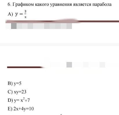 6. Графиком какого уравнения является парабола A) y = 3 B) y=5 C) xy=23 D) y=x2+7 E) 2x+4y=10