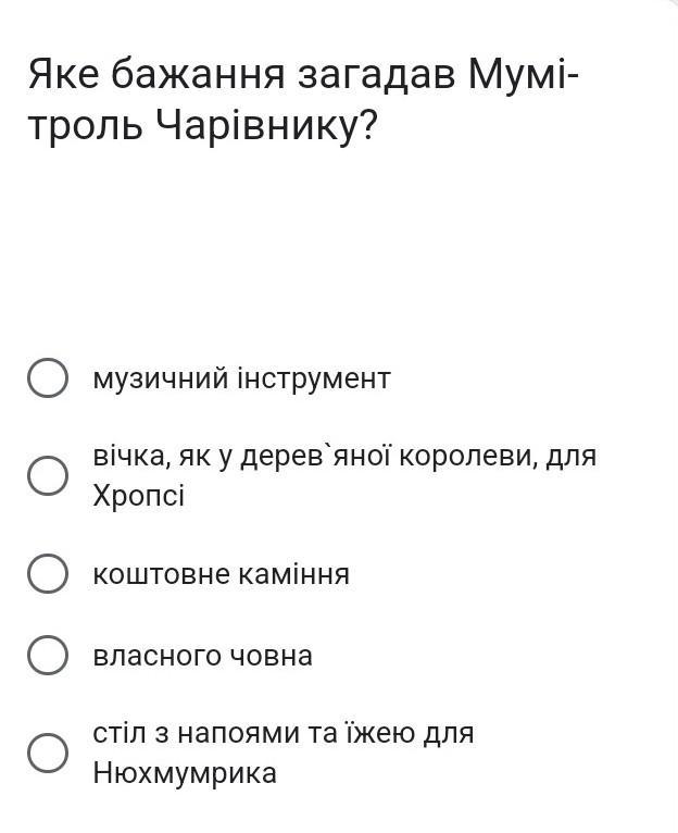 Яке бажання загадав Мумі- троль Чарівнику? о музичний інструмент O вічка, як у дерев'яної королеви, для Хропсі О коштовне каміння О власного човна стіл з напоями та їжею для Нюхмумрика