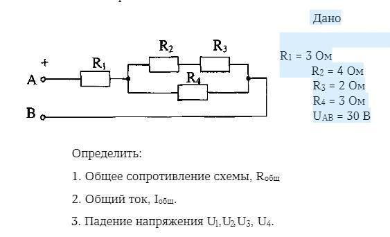 1. R23=R2+R3=2+4=6; 1/R234=1/R23+1/R4=1/6+1/3=3/6=1/2; R234=2; R=R1+R234=3+2=5ом. 2. I=U/R=30/5=6a; 3/ U1=I*R1=6*3=18в; U4=U234=I*R234=6*2=12в; U23=U4=12; I23=U23/R23=12/6=2а; U2=I23*R2=2*4=8в; U3=I23*R3=2*2=4в;