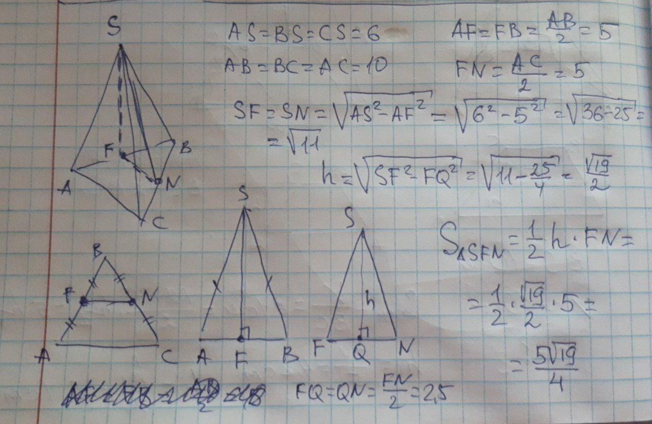 в правильной треугольной пирамиде sabc с основанием abc проведено сечение через середины ребер AB и BC и вершину S. Найдите площадь этого сечения если боковое ребро пирамиды равно 6, а сторона основания равна 10