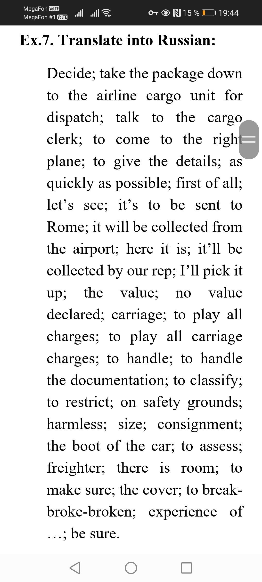 Решать (решаться); отнесите посылку в грузовой отсек авиакомпании для отправки; поговорите с грузчиком; пройти к правому самолету; сообщить подробности; как можно быстрее; прежде всего; давайте посмотрим; его нужно отправить в Рим; его заберут из аэропорта; вот он; он будет взят нашим представителем; я возьму его; стоимость; стоимость не объявлена; перевозка; cнять все обвинения; снять все провозные платежи; обрабатывать; обработать документацию; классифицировать; запретить; из соображений безопасности; безвредный; размер; партия (товара); багажник автомобиля; оценивать; грузовое судно; есть комната; чтобы быть уверенным; покрытие; сломать - сломал - сломанный; опыт чего-то; быть уверенным.