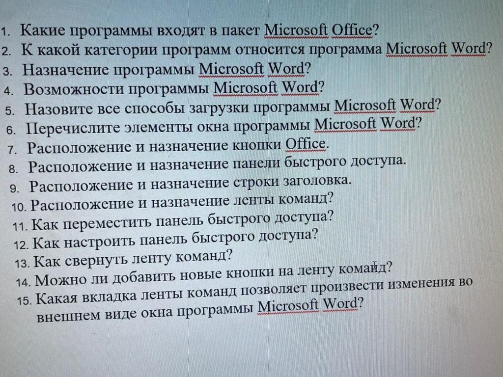 1. Какие программы входят в пакет Microsoft Office? 2. К какой категории программ относится программа Microsoft Word? 3. Назначение программы Мicrosoft Word? 4. Возможности программы Microsoft Word? 5. Назовите все способы загрузки программы Microsoft Word? 6. Перечислите элементы окна программы Microsoft Word? 7. Расположение и назначение кнопки Office. 8. Расположение и назначение панели быстрого доступа. 9. Расположение и назначение строки заголовка. 10. Расположение и назначение ленты команд? 11. Как переместить панель быстрого доступа? 12. Как настроить панель быстрого доступа? 13. Как свернуть ленту команд? 14. Можно ли добавить новые кнопки на ленту команд, 15. Какая вкладка ленты команд позволяет произвести изменения во внешнем виде окна программы Microsoft Word?