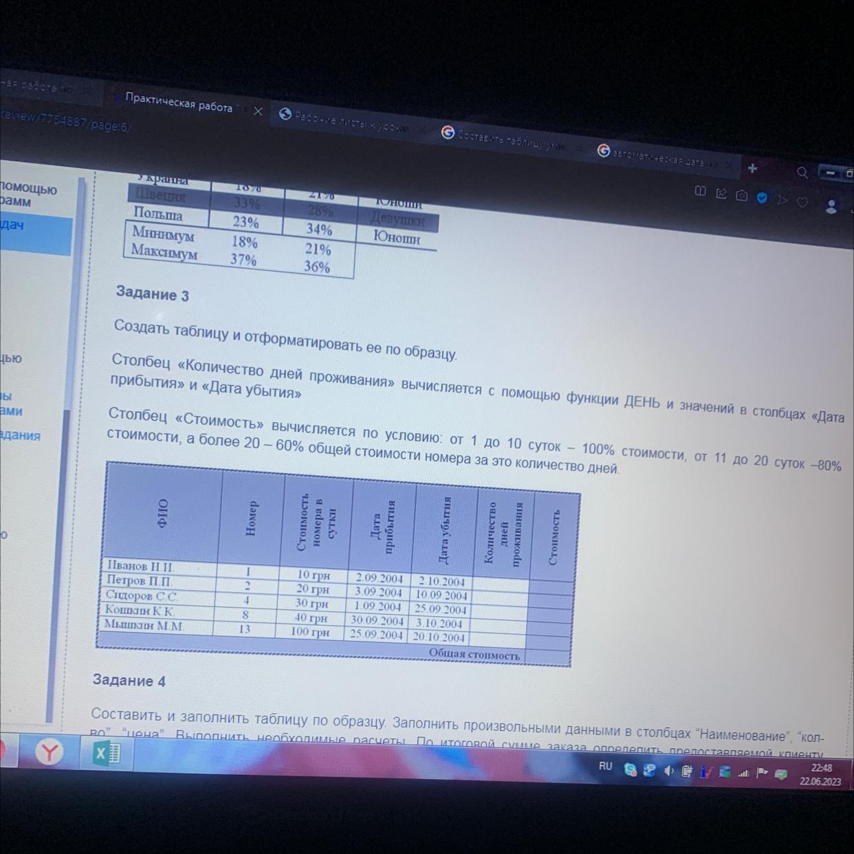 Для создания таблицы и вычисления столбцов "Количество дней проживания" и "Стоимость" согласно указанным условиям, можно воспользоваться функциями в программе Microsoft Excel или подобных приложениях для работы с таблицами.