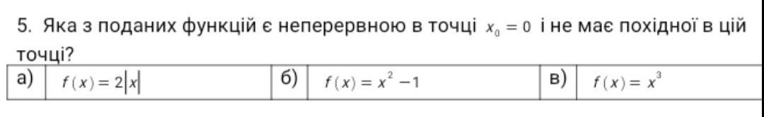 щоб функція в точці не мала похідної, то в рівнянні похідної повинна бути умова, яка не має значень в конкретній точці(тобто дана умова не визначається в конкретній точці) . Наприклад, похідна від модуль ікс = ікс поділити на модуль х. Модуль ікса у точці ноль складає 0. Арифметична дія ділення на ноль є неможливою, отже у точці 0 модуль ікса похідної немає. Аналогічно не мають похідної і функції виду модуль ікс помножити на к, де к - константа. До складу цих функцій входить функція 2 помножити на ікс. Отже варіант а) є розв'язком цієї задачі.