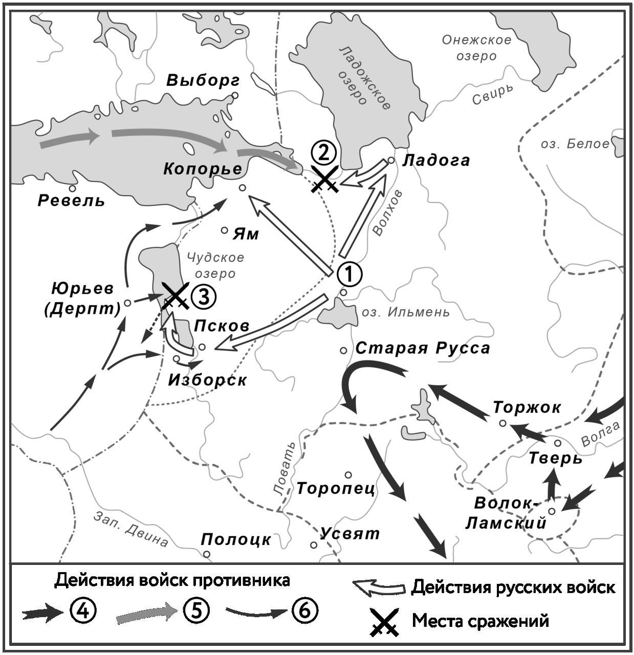 Напишите название рыцарского ордена, с войсками которого сражались русские полки в изображённом на схеме сражении под цифрой «3». Ответ запишите одним словом, в именительном падеже без точки в конце по образцу: Монгольский