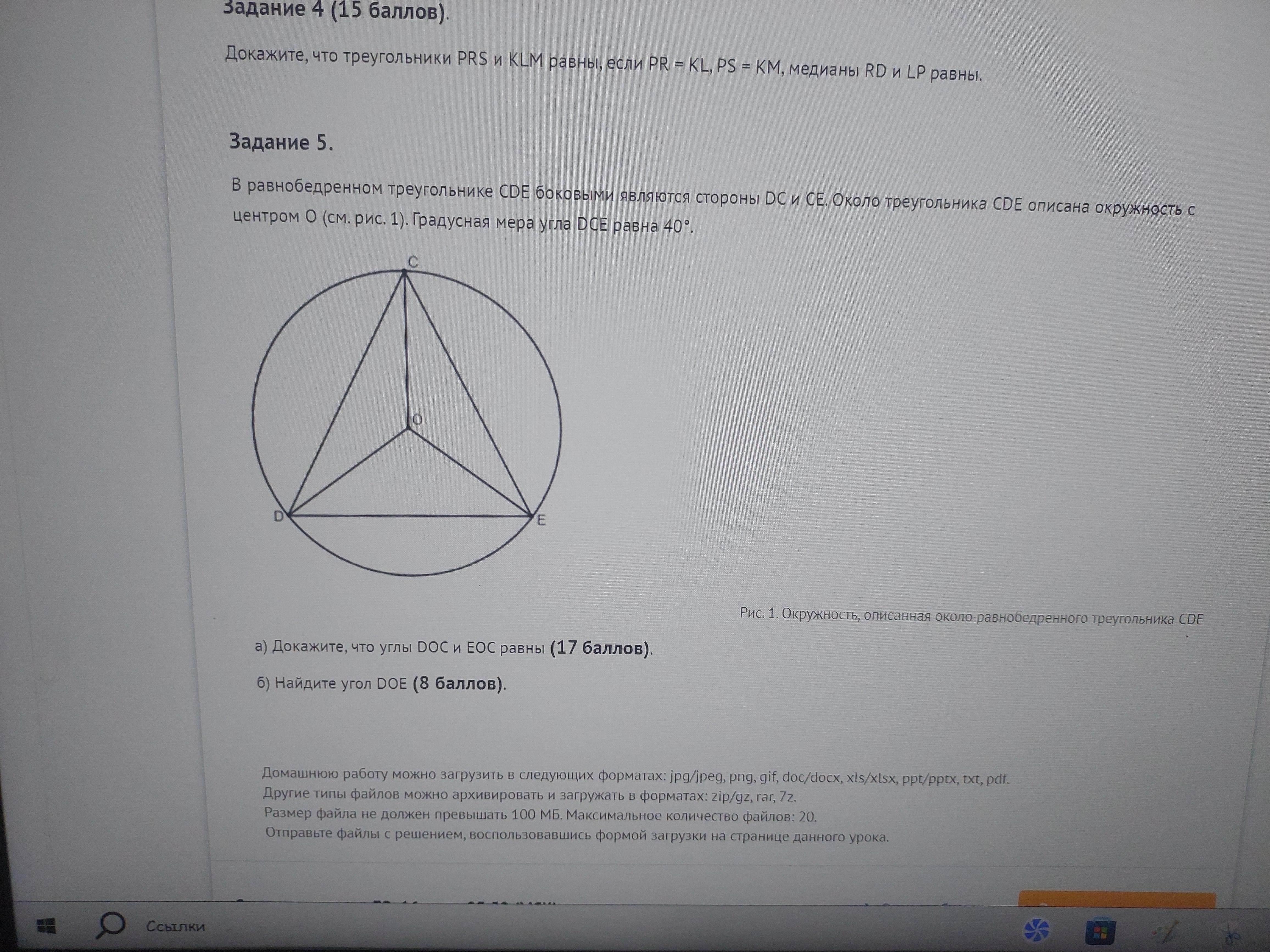 ∆DOC=∆EOC по 3 сторонам , значит соответственные элементы равны, следовательно,∠DOC=∠EOC.