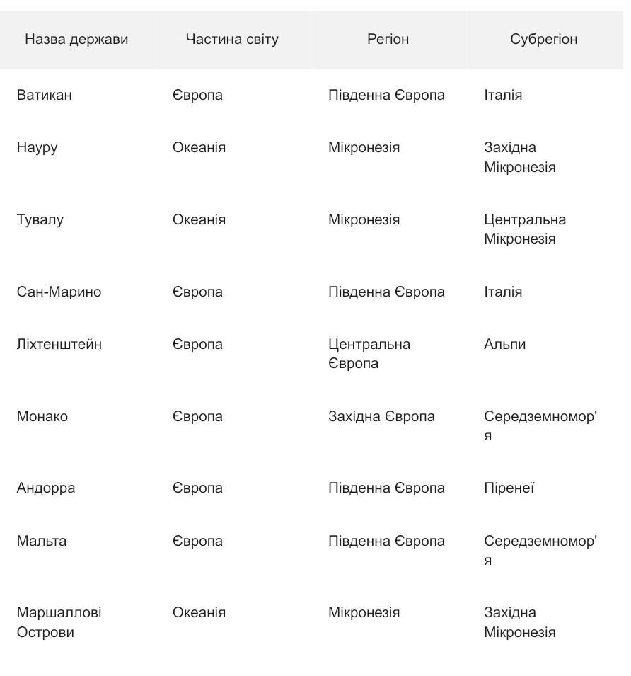 4. Десять держав світу з найменшою чисельністю населення. Список починати з держави з найменш чисельним населенням, а далі по зростаючий - назва держави, в якій частині світу розташована, в якому регіоні, субрегіоні.