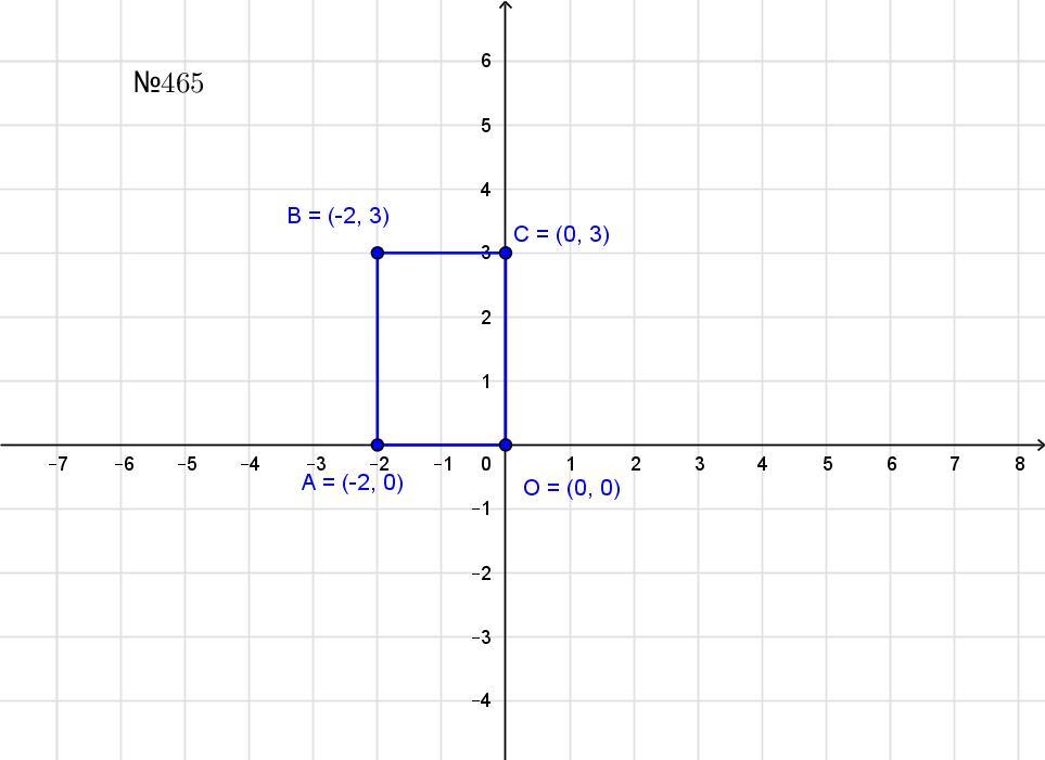 № 465. Построить прямоугольник по координатам его вершин: A (-2; 0), B (-2; 3), C (0; 3), 0 (0; 0).