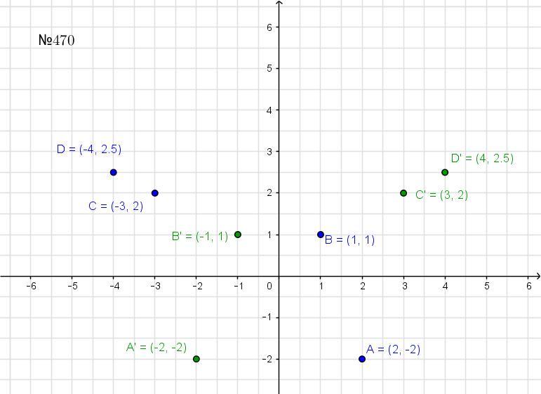 № 470. Даны точки А (2; -2), В (1; 1), C (-3; 2), D(-4;-22). Построить точки, симметричные им относительно оси Оу. Определить коор- динаты полученных точек.