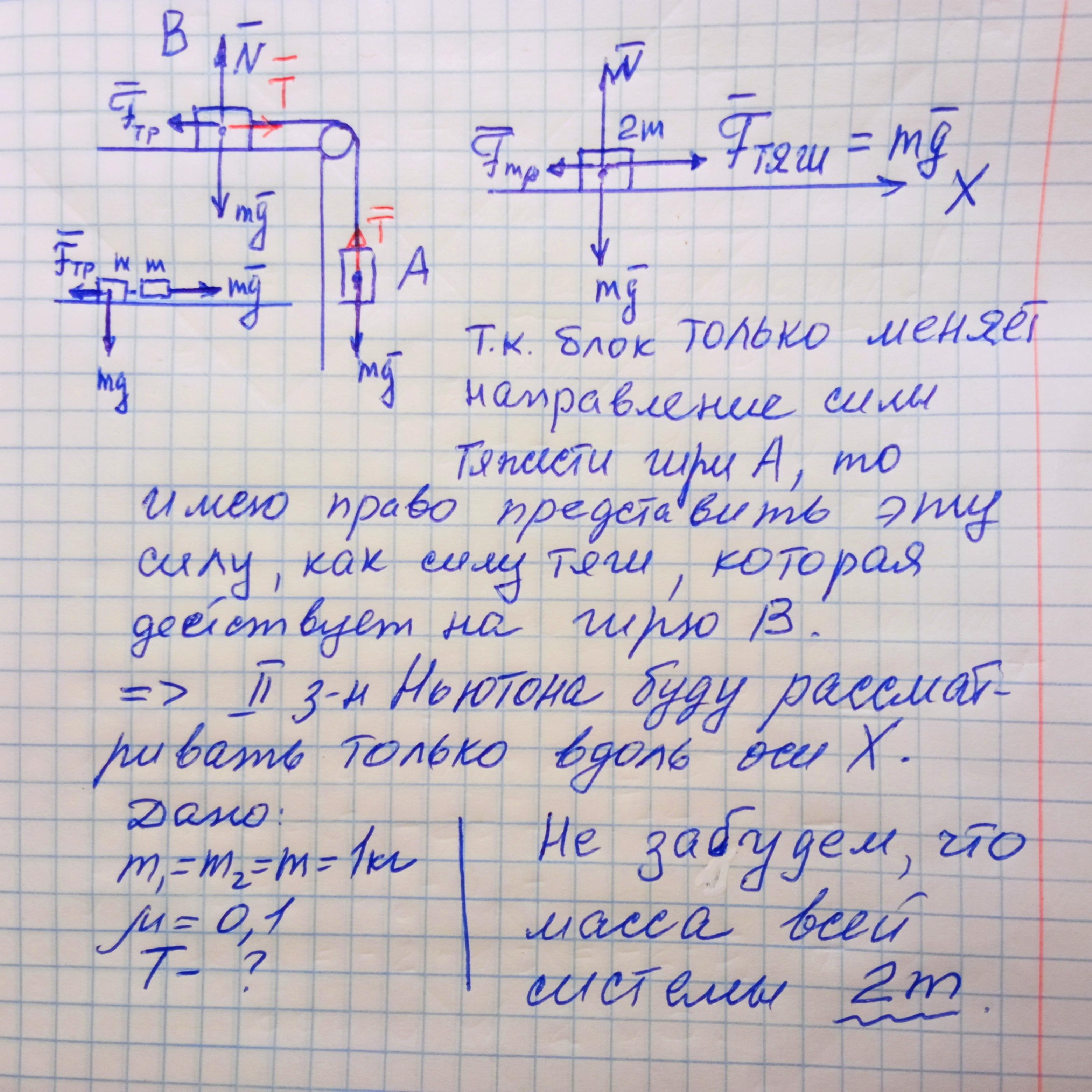 Невесомый блок укреплен на конце стола. Две гири А и В равной массы m1=m2=1кг соединены тонкой невесомой нерастяжимой нитью, перекинутой через блок. Коэффициент трения гири В о стол 0,1. Трением в блоке пренебречь. Ускорение свободного падения 10 м/с2. Натяжение нити во время движения в ньютонах равно.