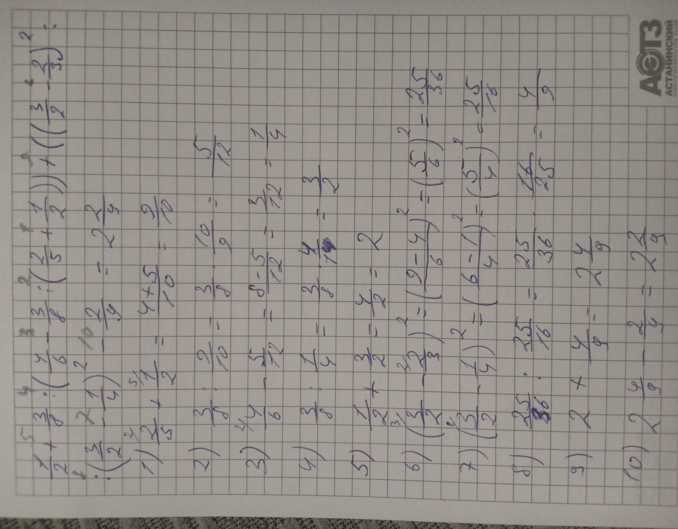 1) 1/2+3/8:[4/6-3/8:(2/5+1/2)]+[(3/2-2/3)в квадрате :(3/2-1/4)в квадрате]-2/9