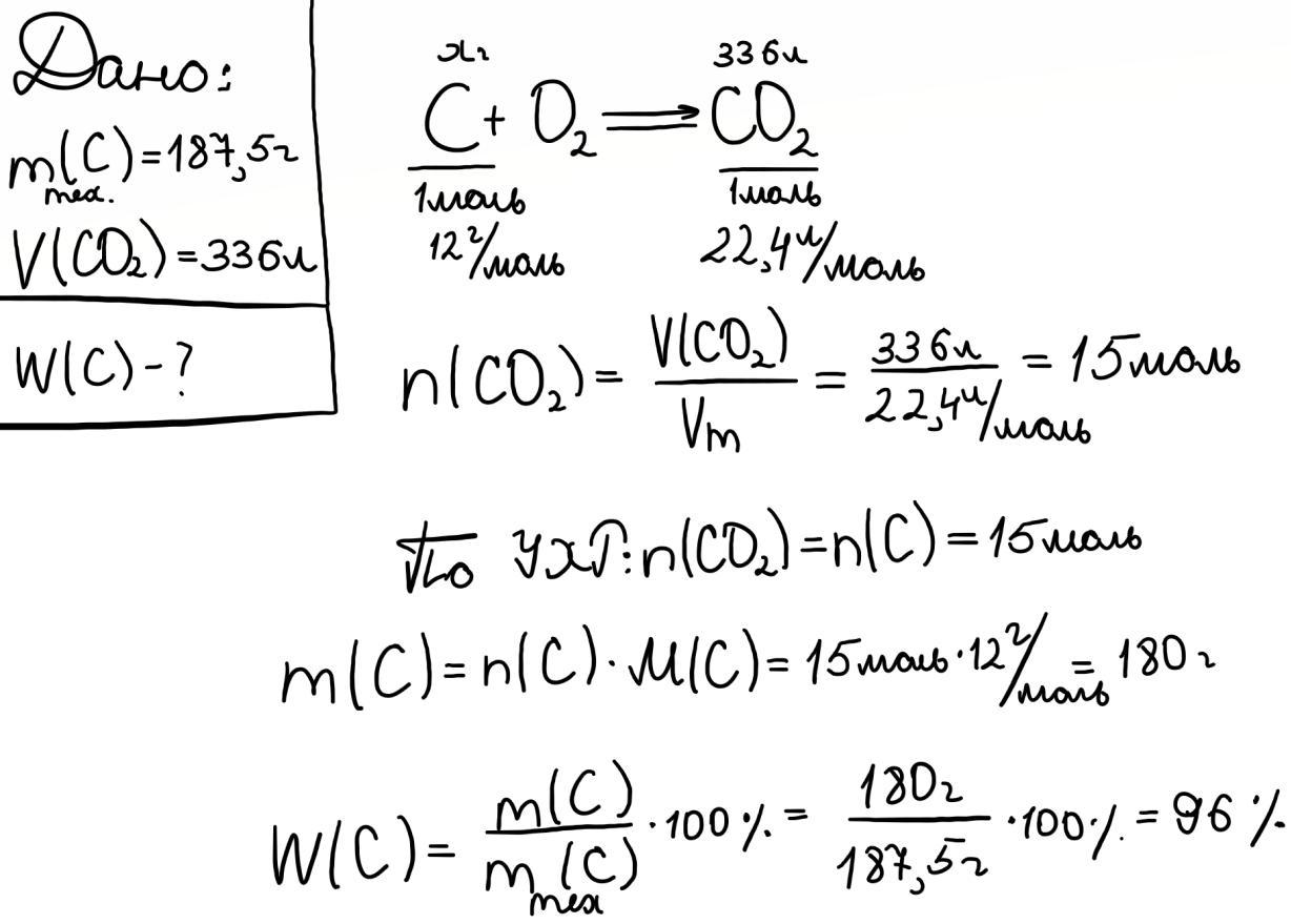 При сгорании 187.5 г угля образовалась 336 литров оксида углерода (4) Вычислите массовую долю углерода в угле