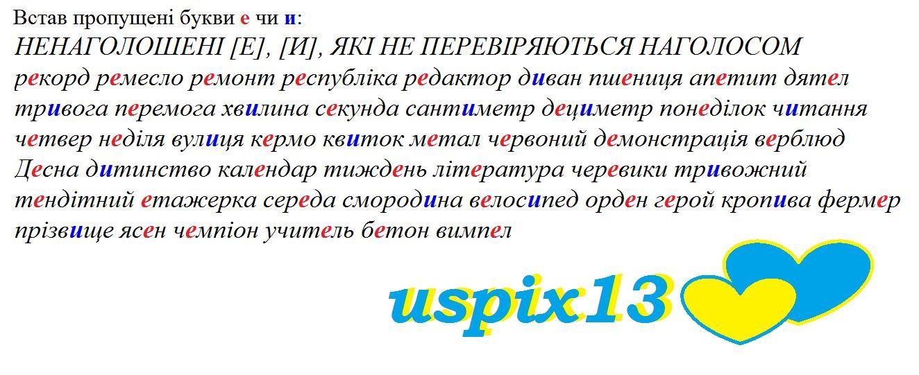 Встав пропущені букви е, u: р...корд р...месло р...монт р...спубліка р...дактор Д... ван пш...ниця ап...тит дят...л тр...вога п...ремога хв...лина с...кунда сант...метр НЕНАГОЛОШЕНІ [Е], [И], ЯКІ НЕ ПЕРЕВІРЯЮТЬСЯ НАГОЛОСОМ д...ц...метр пон...дiлок ч...таннЯ ч... твер н...дiля вул...ця к...рмо KB...TOK м...тал ч...рвоний Д...монстрація в...рблюд Д...сна Д...тинствО кал...ндар тижд...нь літ...ратура чер...вики тр...вожний т...ндітний ...тажерка сер...да смород...на в...лос...пед орд...н г...рой кроп...ва ферм...р прізв...ще яс...н ч...мпіон учит...ль б...тон вимп...л
