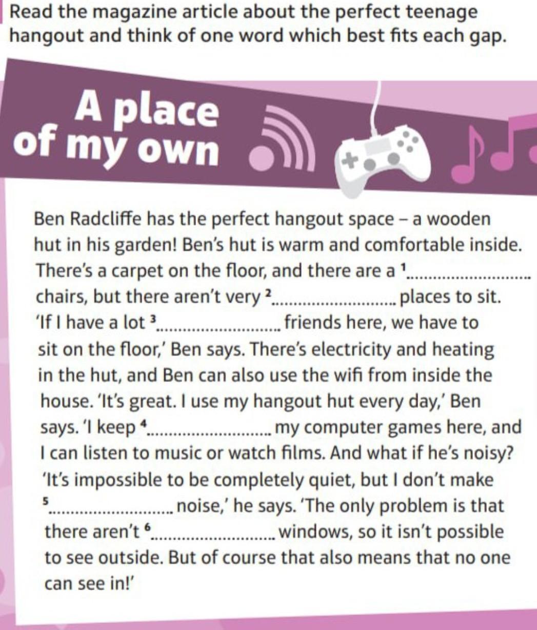 Read the magazine article about the perfect teenage hangout and think of one word which best fits each gap. A place of my own Ben Radcliffe has the perfect hangout space - a wooden hut in his garden! Ben's hut is warm and comfortable inside. There's a carpet on the floor, and there are a ¹.. chairs, but there aren't very. 2.......................place.. to sit.. 'If I have a lot ³....……………... friends here, we have to sit on the floor,' Ben says. There's electricity and heating in the hut, and Ben can also use the wifi from inside the house. 'It's great. I use my hangout hut every day,' Ben says. 'I keep .............. my computer games here, and I can listen to music or watch films. And what if he's noisy? 'It's impossible to be completely quiet, but I don't make noise,' he says. 'The only problem is that ................windows, so it isn't possible 5 there aren't .. to see outside. But of course that also means that no one can see in!'