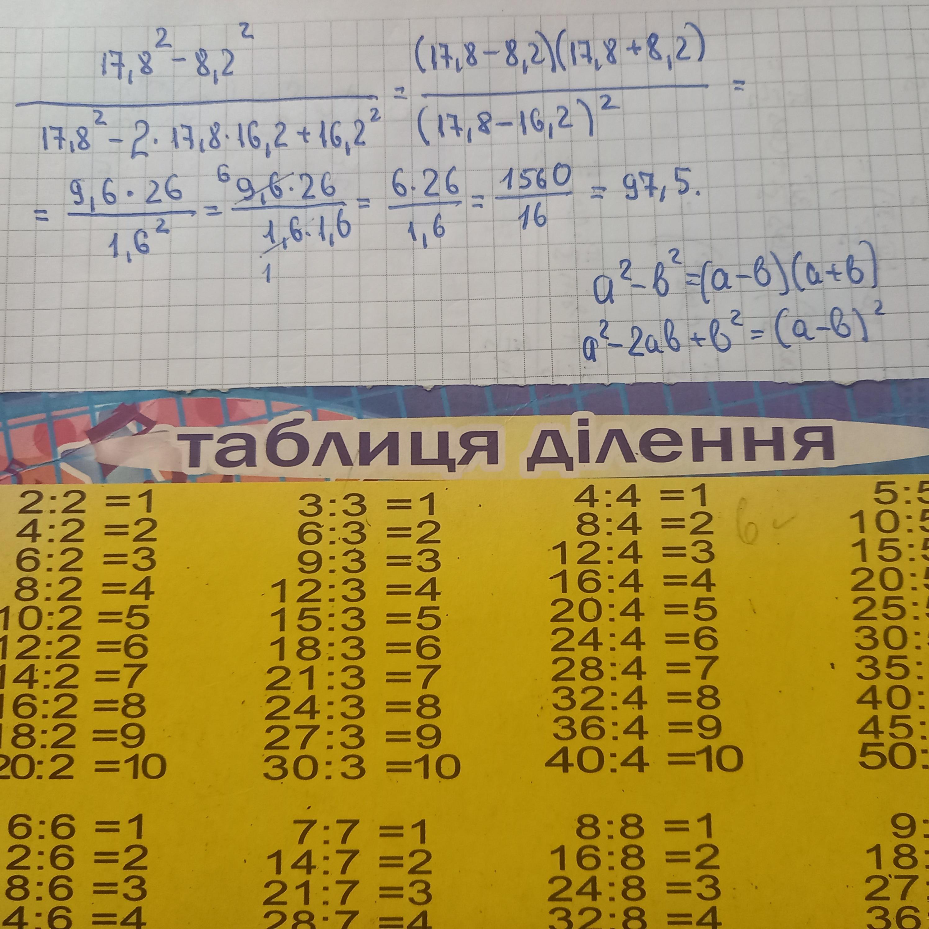(17.8^2 - 8.2^2) / (17.8^2 - 2 * 17.8 * 16.2 + 16.2^2) =