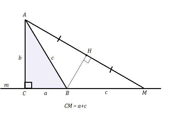 Если продлим катет ВС на длину гипотенузы , то получим отрезок СМ , длиной равный сумме катета а и гипотенузы с : СМ = a + c .