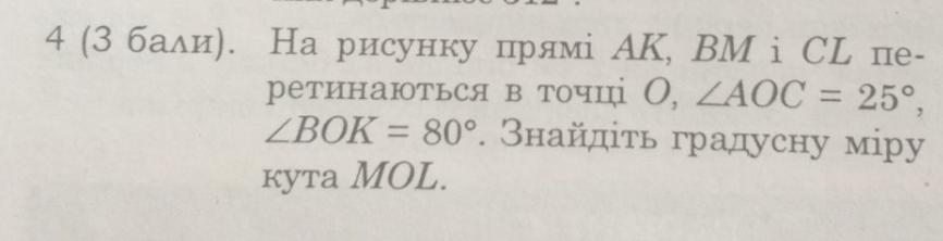 На рисунке прямые АК, ВМ и СL пересекаются в точке О, ∠AOC = 25°, ∠BOK = 80°. Найдите градусную меру угла MOL.