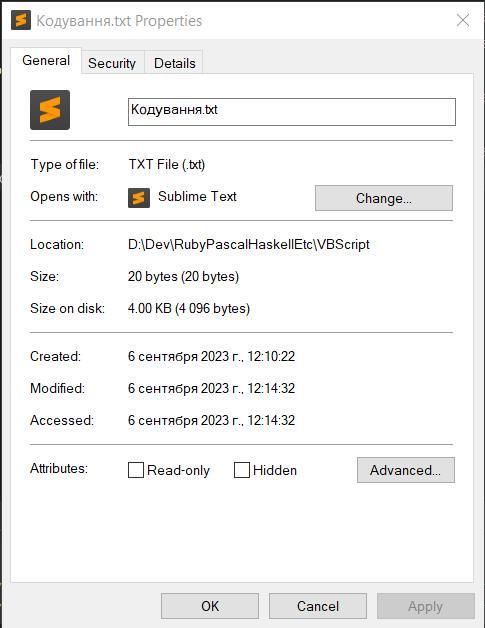 Збережіть даний файл з кодуванням ANSI. За допомогою контекстного меню файлу з’ясуйте його розмір в байтах і запишіть до зошита.