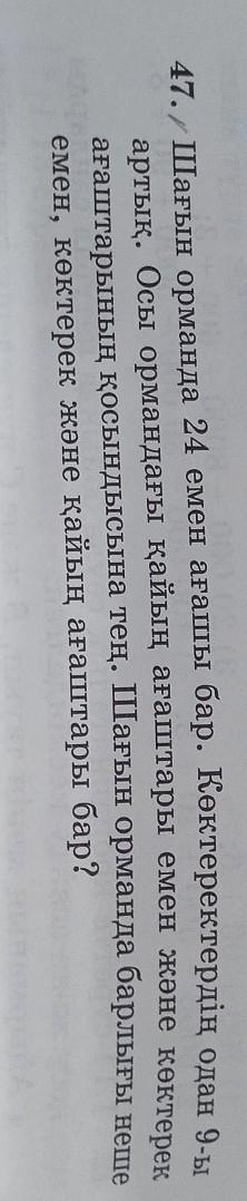 Шағын орманда 24 емен ағашы бар.Көктеректердің одан 9-ы артық.Осы ормандағы қайың ағаштары емен және көктерек ағаштарының қосыңдысына тең.Шағын орманда барлығы неше емен, көктерек және қайың ағаштары бар?