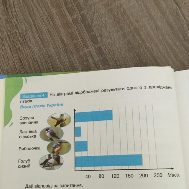 Маса ластівки сільської дорівнює 20 (щоб дізнатись це, ми визначили ціну поділки, взявши два сусідніх числа та поділивши їх різницю на кількість поділок між ними), а це у 6 разів менше за масу зозулі сільської, адже 120:20=6.