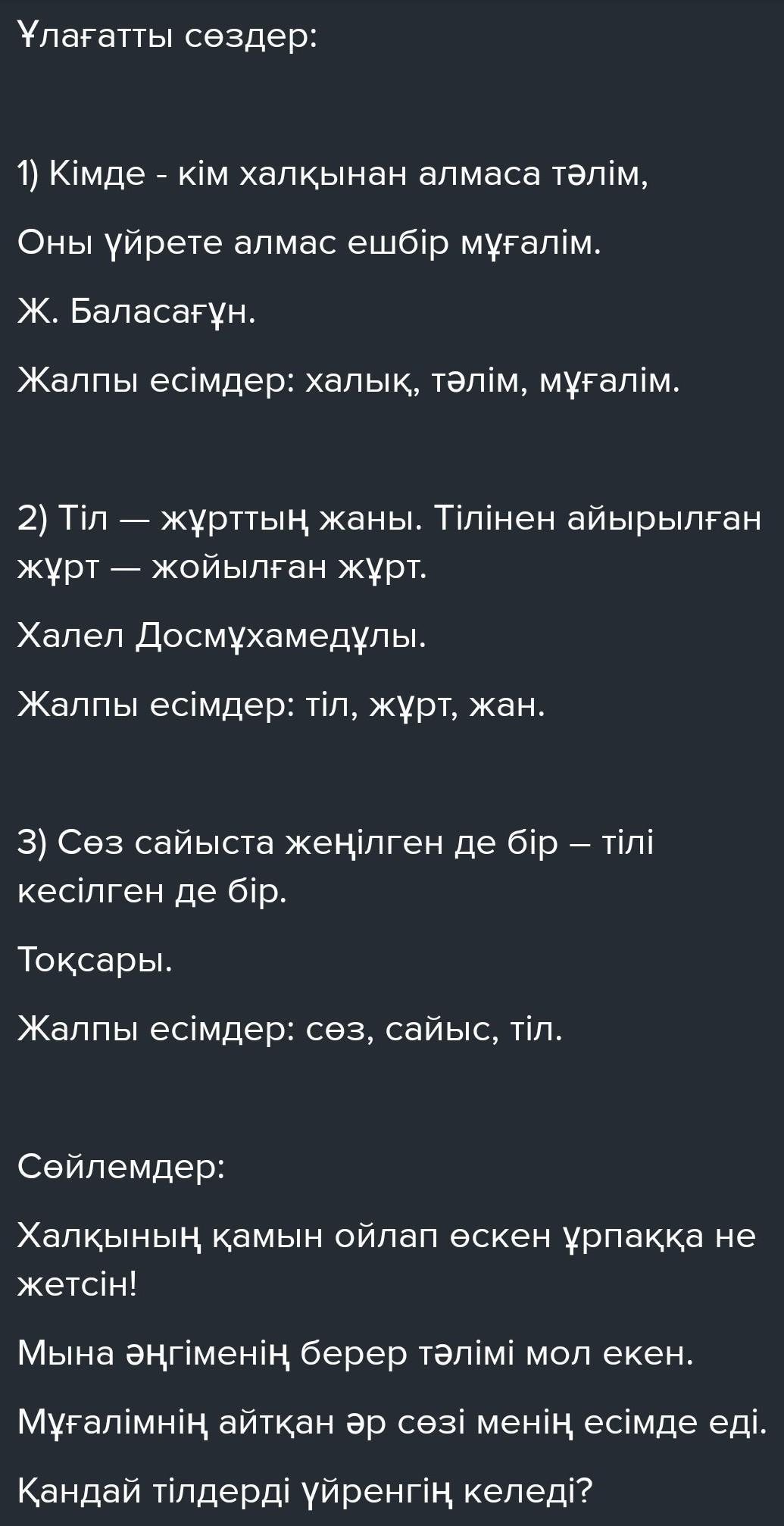 ЖАЗЫЛЫМ -тапсырма. Ұлағатты сөздерден жалпы есімдерді тап. Сол сөздерді қатыстырып, сөйлем құрап жаз.