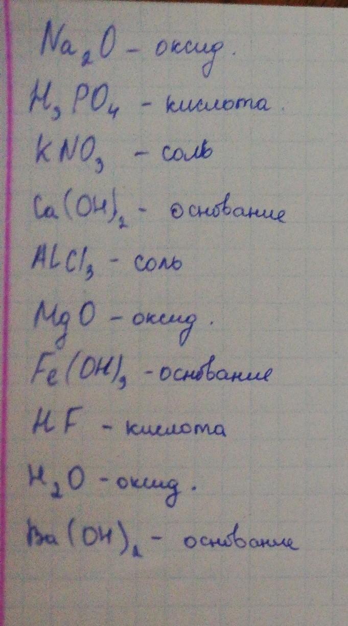 Даны вещества: Na2O, H3PO4, KNO3, Ca(OH)2, AlCl3, MgO, Fe(OH)3, HF, H2O, Ba(OH)2, Ag2O, H2SO4, NaOH, H2SiO3, CaCO3, Fe(NO3)3, Мg3(PO4)2. Распределите их по классам Оксиды Кислоты Основания Соли