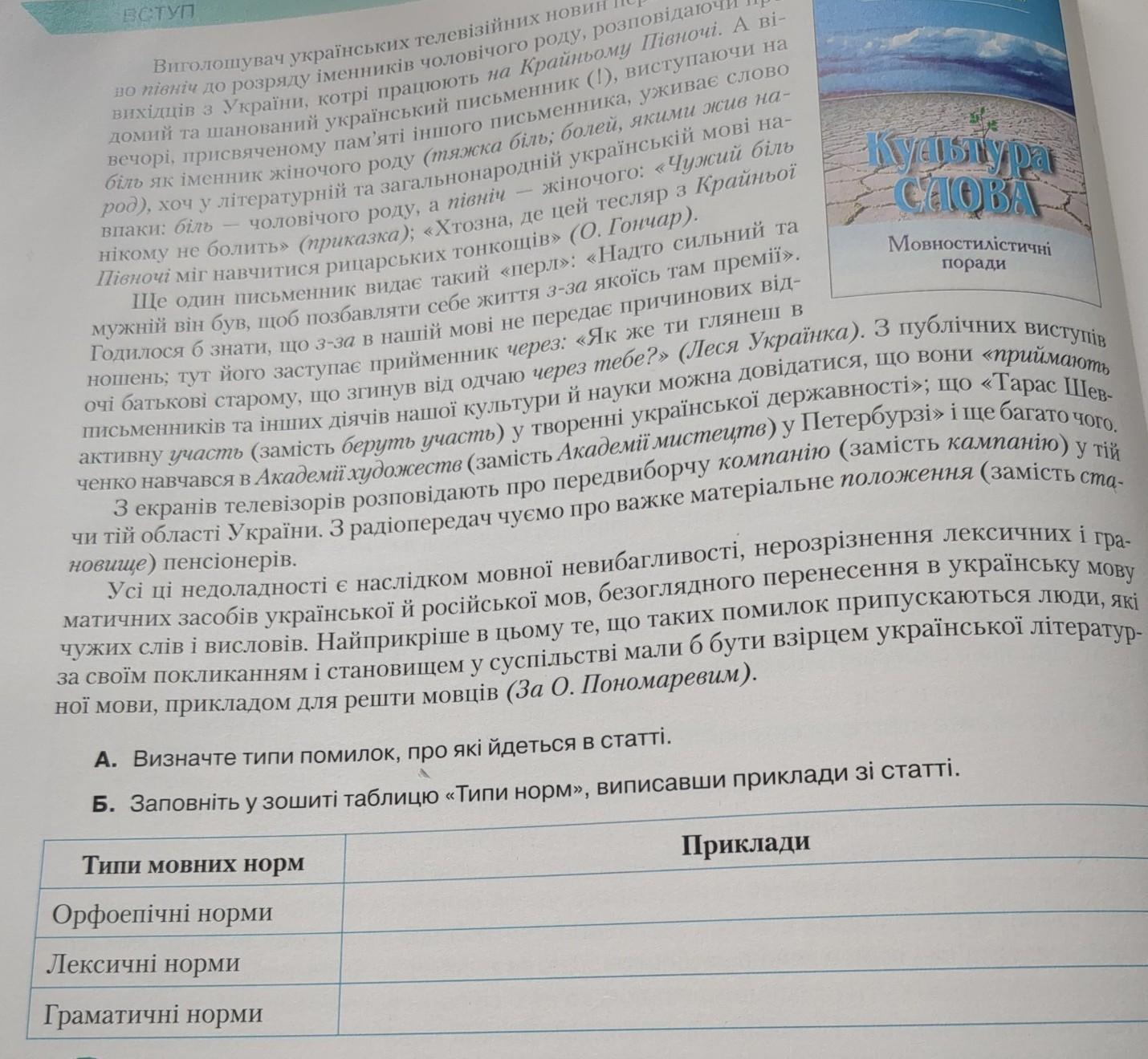 А. Визначте типи помилок, про які йдеться в статті. Б. Заповніть у зошиті таблицю «Тили норм», виписавши приклади зі статті.
