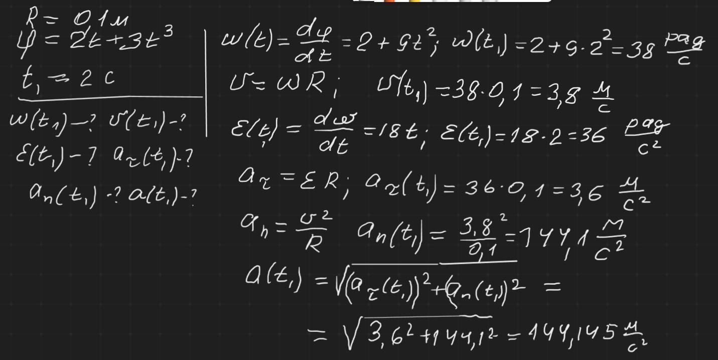 Помогите срочно решить задачу. Колесо радіусом R=0,1 м обертається так, що залежність кута повороту радіуса колеса від часу задається рівнянням: φ = А + Bt2 + Ct3 , де В = 6 с-2 і С=0,7 с-3. Знайти для точок, що лежать на ободі колеса, через час t=3 с після початку руху: а) кутову швидкість ω; б) швидкість v; в) кутове прискорення ε; г) дотичне аτ та нормальне аn прискорения.