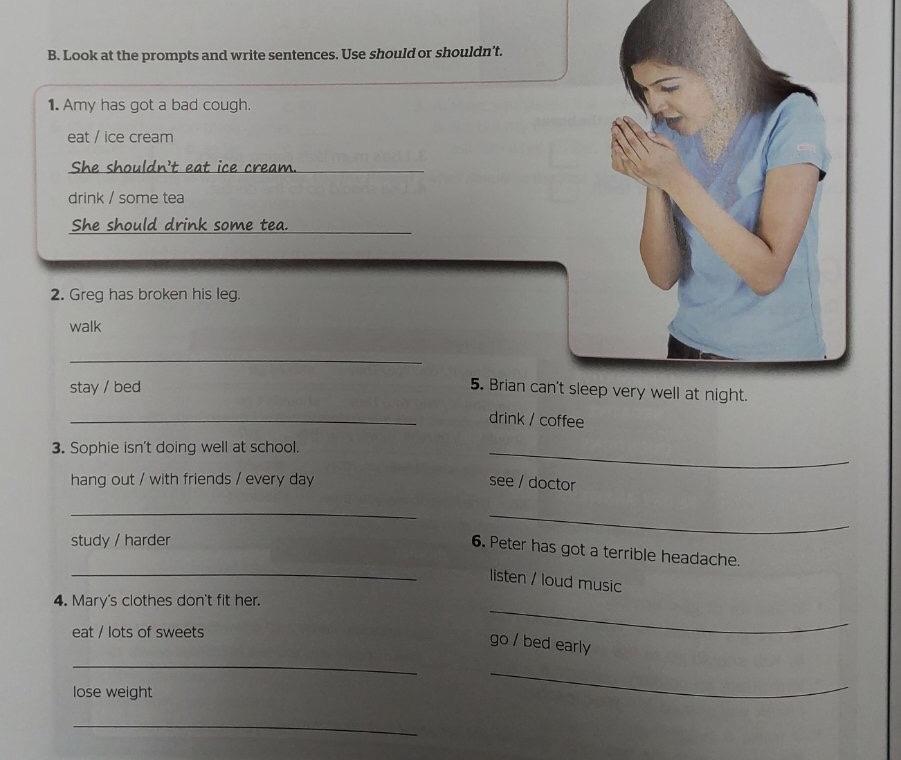 B. Look at the prompts and write sentences. Use should or shouldn't