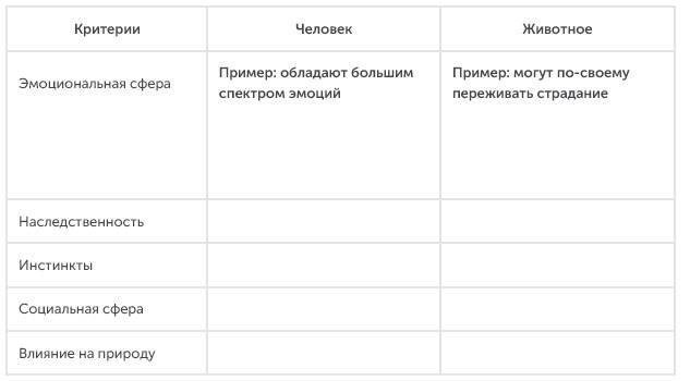 Человек — это биосоциальное существо. Он, имея общие черты с животными, отличается от них. Заполните сравнительную таблицу «Человек и животное», выделив общие и особенные черты по представленным критериям.