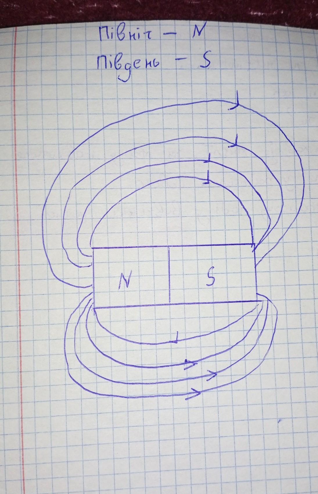 Намалюйте ліній магнітної індукції та вкажіть, де північ і де південь.