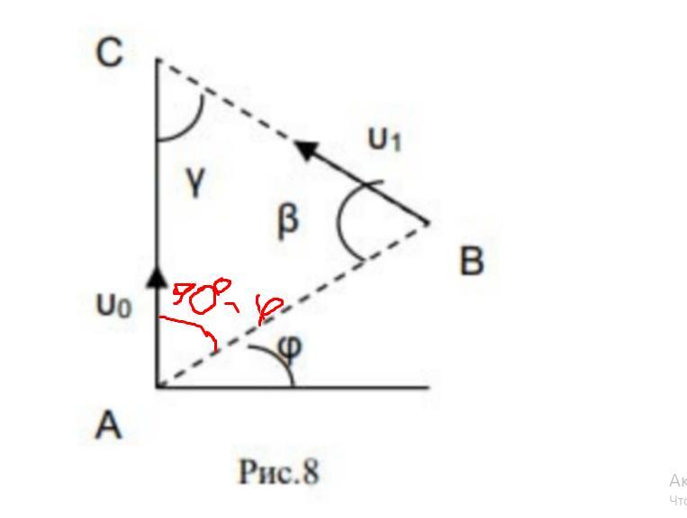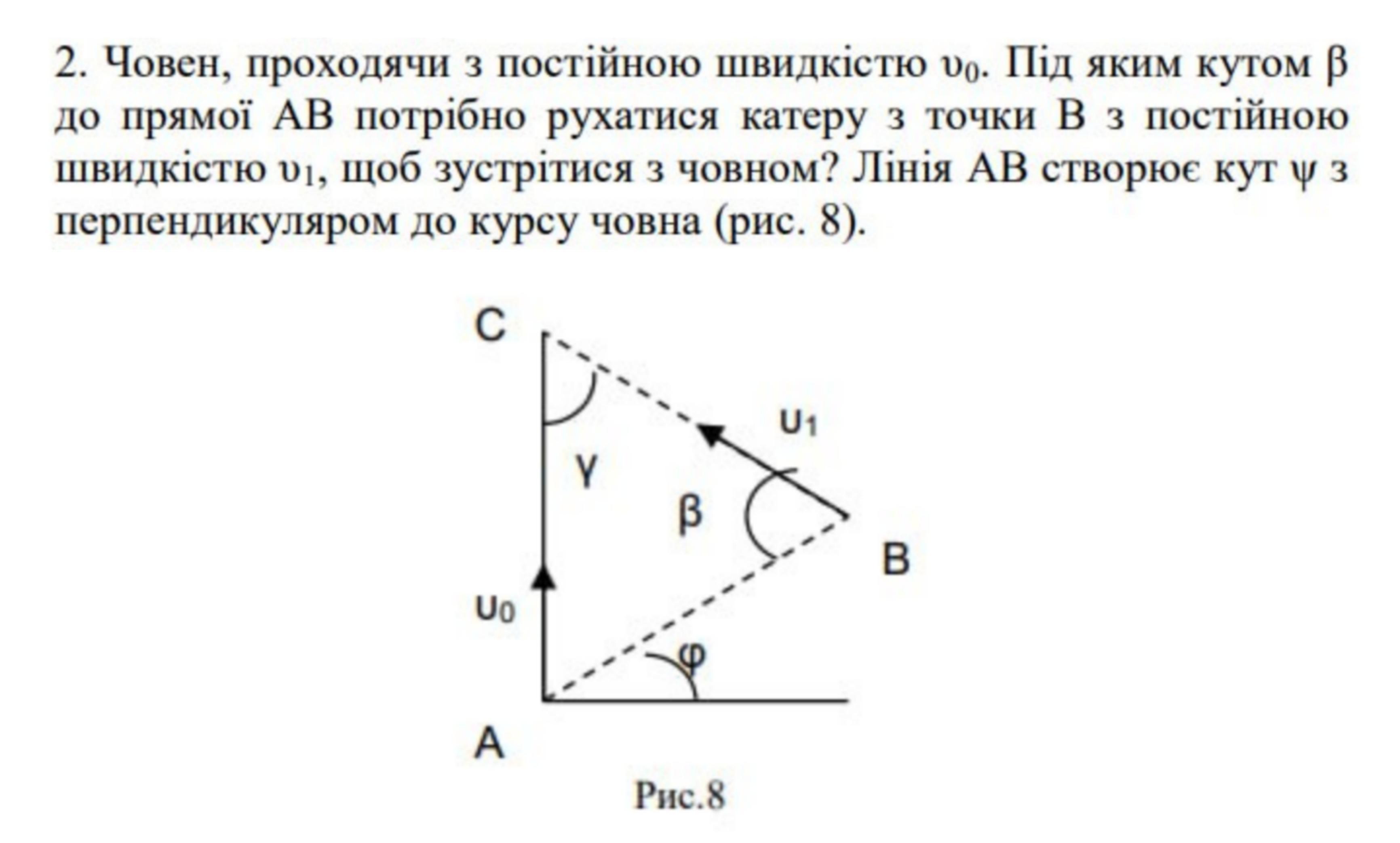Смотрите фото. Имеем треугольник, образованный линией AB, путем движения катера и путем движения катера. У этого треугольника есть угол ψ между линией AB и перпендикуляром к направлению движения катера.