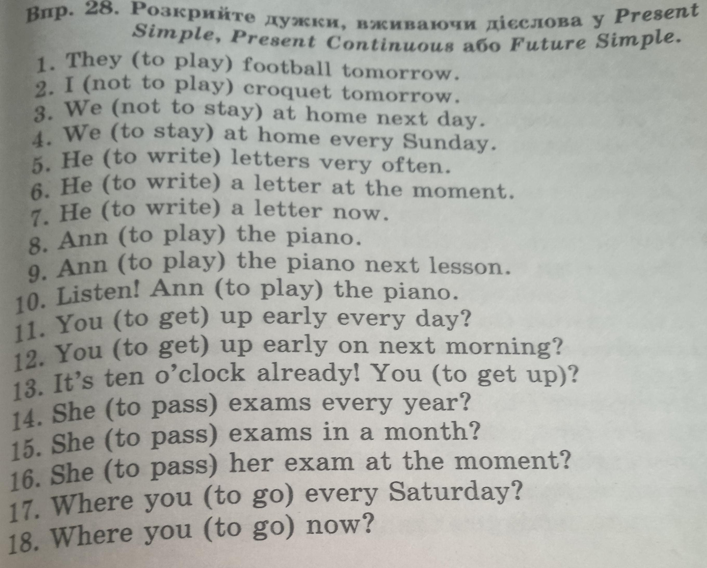 5. He write letters very often.6. He write a letter at the moment.7. He write a letter now.8. Ann play the piano.9. Ann play the piano next lesson.