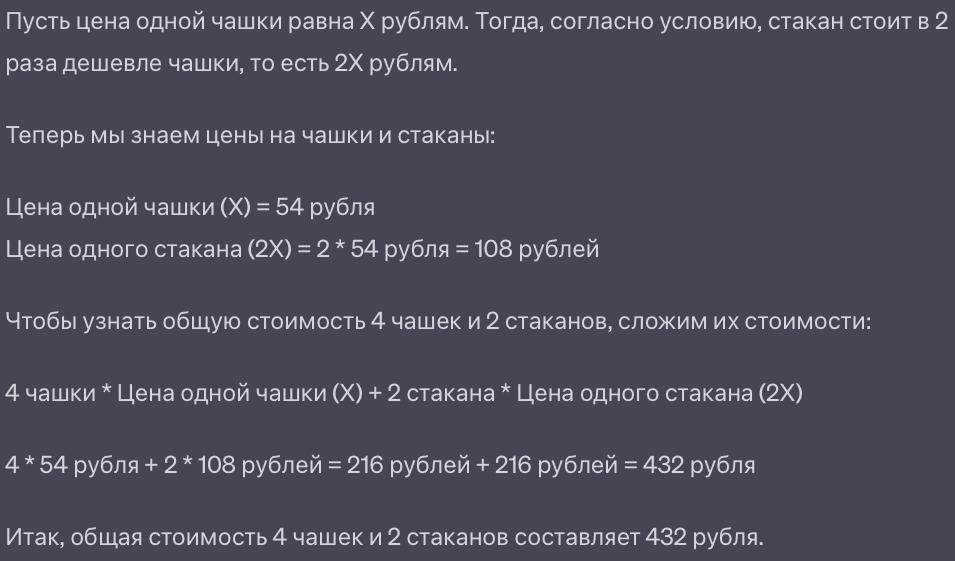 Реши задачу. МАТЕМАТИКА В ЖИЗНИ 7 В магазине купили 4 чашки по 54 рубля и 2 стакана. Сколько стоят 4 чашки и 2 стакана, если стакан в 2 раза дешевле чашки? пж Быстрее надо до 16.00 скинуть сейчас 14:48