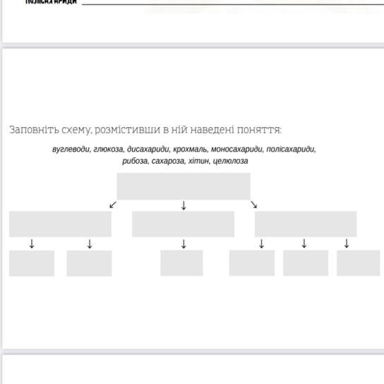 моносахариди:рибоза, глюкоза дисахариди:сахароза. полісахариди:хітин, крохмаль,