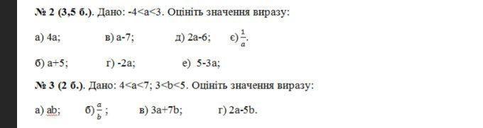№ 2 . Дано: -4-а-3. Оцiнiть значення виразу: a) 4а; B) a-7; x) 2a-6; €)¹ д) б) a+5: г) -2а; e) 5-3а; № 3 Дано: 4