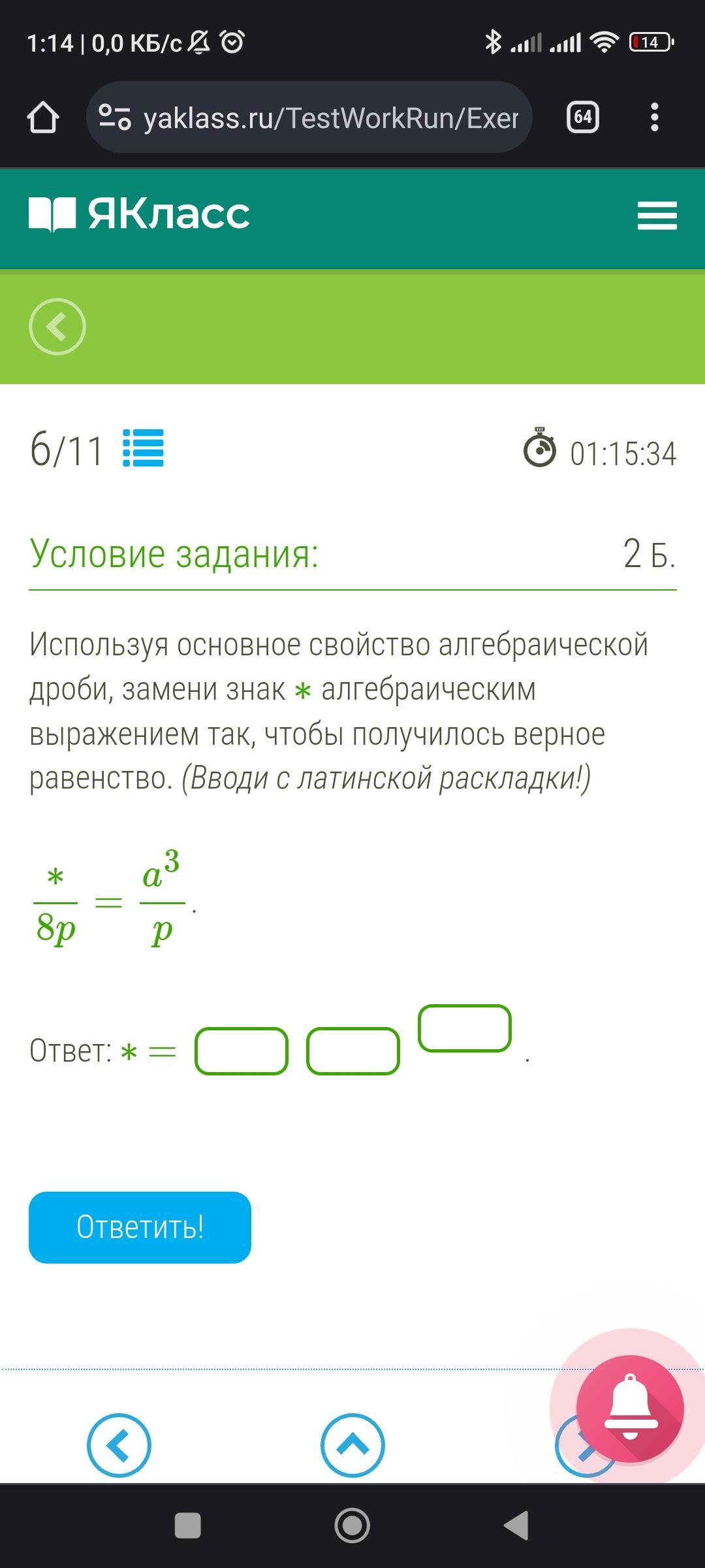 Используя основное свойство алгебраической дроби, замени знак * алгебраическим выражением так, чтобы получилось верное равенство. (Вводи с латинской раскладки!)